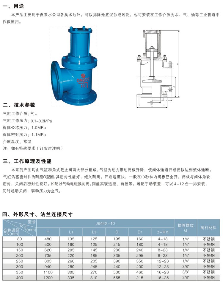 【产品介绍】:J644X气动角式排泥阀,主要用于自来水公司各类水池外,可以排除池底泥沙或污物,也可安装在工作介质为水、气、油等工业管道中作截流作用。