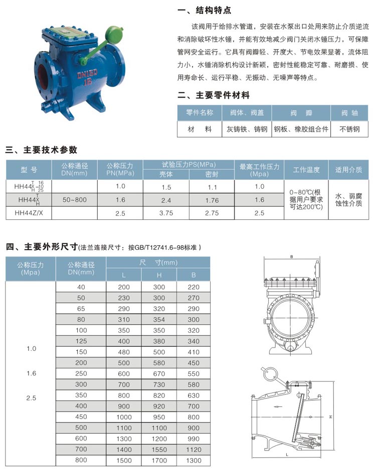 【产品介绍】:HH44Z/X、HH44X(T、H)微阻缓闭止回阀,用于给排水管道。防止介质逆流和破坏性水锤,有效减少阀门关闭时的压力,可保障管网安全运行。